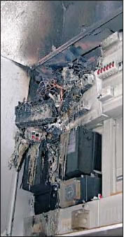 Der ausgebaute Sicherungsverteiler am Zähler Modell 1970 ist durch ständigen Anschluss weiterer Elektrogeräte überlastet worden. Desweiteren wurde in dieser Anlage niemals ein Kontrollcheck getätigt ! Die loosen angeschmorten Drähte waren so heiß, daß die Holzrückwand der Zähleranlage bereits schwarze stellen zeigte ! Fazit: Elektroanlagen in gewissen Abständen überprüfen lassen ( E- Check ) |