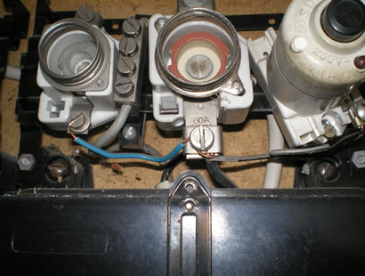 Ein Sicherungsverteiler - mit "speziellen Einspeisadaptern" und losen Klemmen - hat einen Brand schon vorprogramiert. |