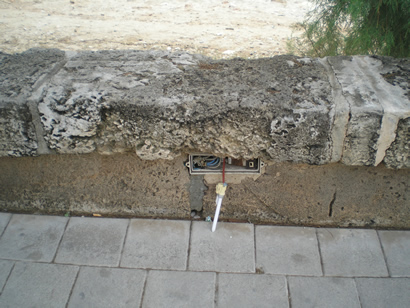 Lichtmastanschluß am Gehweg, Mast fehlt. Strom ist auf dem Kabel ab Dämmerungseinbruch. |