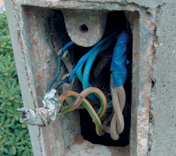 Verteilerdose für Sprech und Klingelanlage 6-12 Volt, gemischt mit der Aussenbeleuchtung 235 Volt . Unzulässig, Stromschlaggefahr! |
